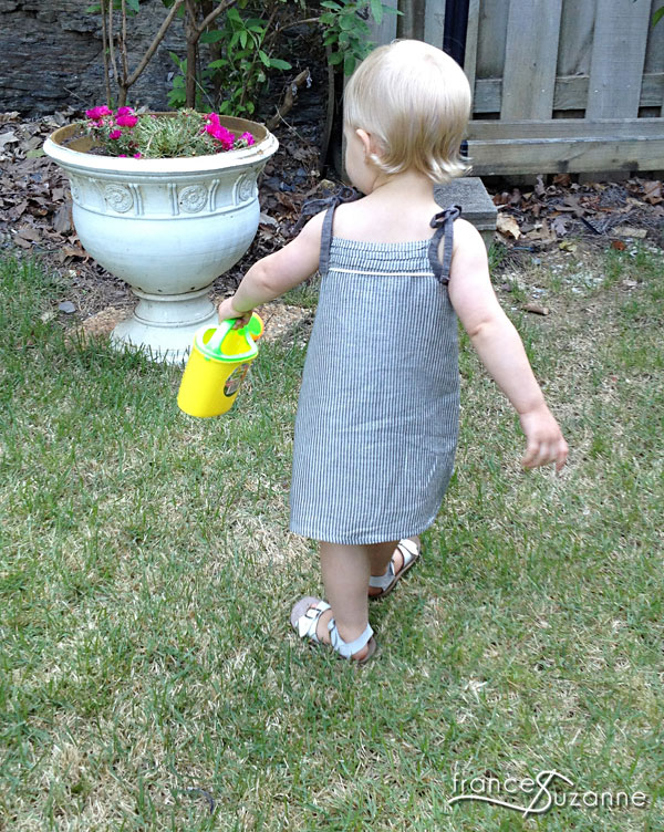 Turning to our favorite Oliver + S patterns for inspiration, we opted to do a pattern we had not attempted yet: the Popover Sundress, a free downloadable pattern, along with some Oliver + S Tea Party bloomers. Our first glitch to this plan was the sizing. The smallest size in the Popover Sundress was a size 2, but we really needed an 18 month version. So, we drafted the pattern down {a first for us} to fit our niece. The front and back pattern pieces were cut on the fold, so we took out 1/4 inch from the center fold on both before cutting. This actually translated to an inch removed (1/2 inch on the front, and 1/2 inch on the back).