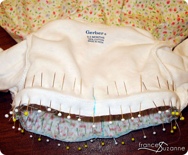 Next, I opened the seam under one armpit approximately 5/8 inch to attach the piping to the onesie. After attaching the piping, I stitched the seam under the armpit closed.