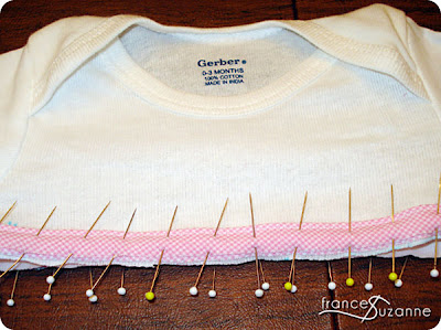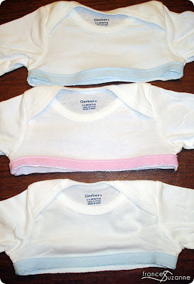 We had really wanted colored onesies, but never found any ‘just right’ and reasonably priced. Maybe one day we will get brave enough to use dye. We ended up purchasing a 3-pack of plain white Gerber onesies. We measured 1″ underneath each armpit and cut the bottom of the onesie off.