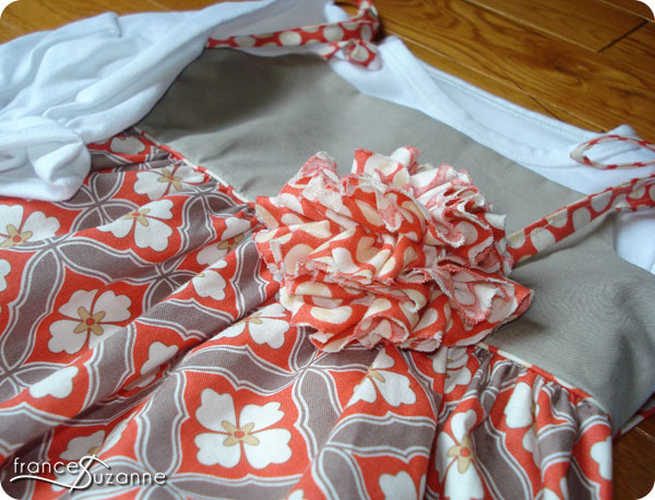 The top portion was made by modifying the Bonnie Blue, Shelby Kate dress pattern. We lengthened the yoke by one inch, and added piping to the base. To accommodate wearing a shirt underneath the top, we added 1/4 inch width to the front of the yoke, as well as the back portion of it. We also chose to make skinny straps for the shoulder ties, instead of ribbon and/or the pattern piece given.