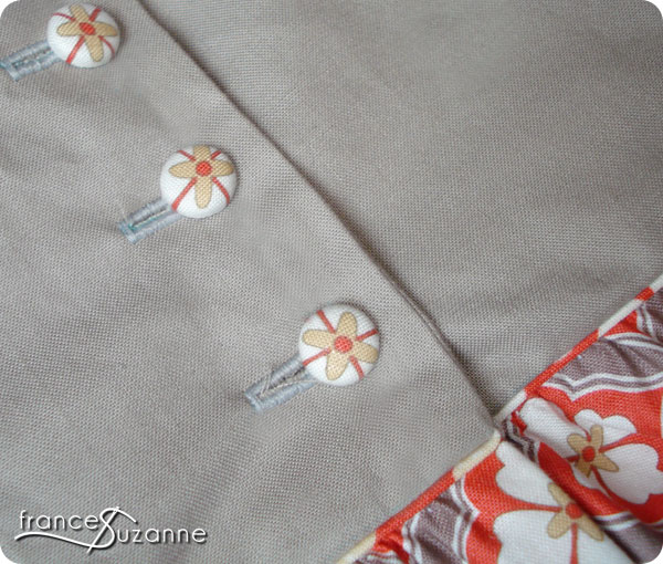 The fabric flower was an experiment. The next one will be better, and then we’ll blog about it! Our final detail came in the three covered buttons placed on the back yoke. It tied in the skirt portion nicely, and seemed to complete the outfit.