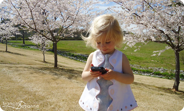 To detail each a bit more, we handstitched around each painted button using white thread as a finishing touch. We also added a camera lens to our new favorite piece of technology …. the instagram button, using one of the gray buttons from the base of the tunic. And, how about that center ‘white camera lens’??