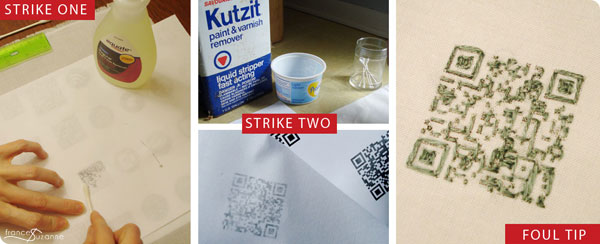 What we learned from this experience: QR codes are picky, picky, picky! And while online tutorials are fabulous, not all are made for a picky QR code transfer. Transfers using nail polish remover, paint remover, and even an embroidered attempt failed miserably.