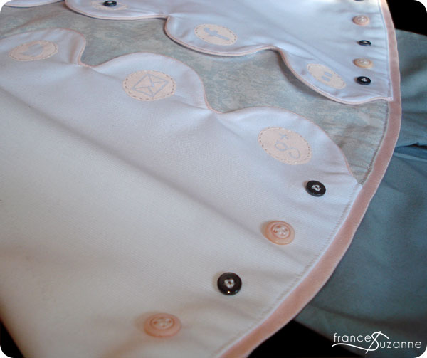 We patterned, spaced, and sewed peach and gray buttons around the base of the tunic, sewing each with white thread. Two slightly different peach buttons were added {back button closure and base button tab, both fastened by another ‘detail’ of abraided DMC thread} that used gray thread to draw the attention in both directions.