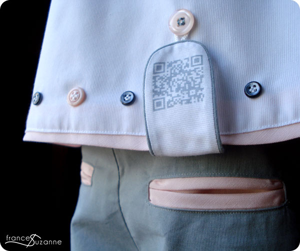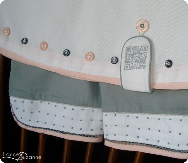 There you have it….it was ALL about the details for us, and we pimped these patterns as best we could! It was an attempt to expand our “detail arsenal” a bit…all while hanging on to our tried-and-true details. Hopefully, we were able to pull off fagoting, fabric paint, French knots, and a QR code in one fatal swoop…an oxymoron of sorts, combining sewing ‘old school’ with ‘new school’ in a classily, acceptable manner! Maybe??