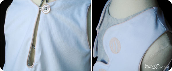It was….interesting, but we were tickled with the results. We also incorporated peach piping on the armholes and around the neck / back button closure.
