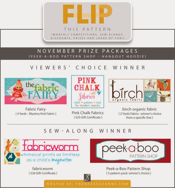 So, now is your chance to inspire the rest of the blogging world! Link up any Peek-a-Boo Pattern Shop, Hangout Hoodie sewn within the past six months….that’s right: the past six months {entries do not have to be sewn during the month of the competition – another perk to the “Flip this Pattern” sew-along}. You may enter more than one item in the sew-along competition….the more the merrier! And, no, you do not have to have a blog to participate. Share your creation on your flickr photostream and link up from there.