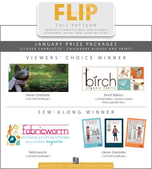 So, now is your chance to inspire the rest of the blogging world! Link up any Clever Charlotte, Chickadee Blouse and Skirt sewn within the past six months….that’s right: the past six months {entries do not have to be sewn during the month of the competition – another perk to the “Flip this Pattern” sew-along}. You may enter more than one item in the sew-along competition….the more the merrier! And, no, you do not have to have a blog to participate. Share your creation on your flickr photostream and link up from there.