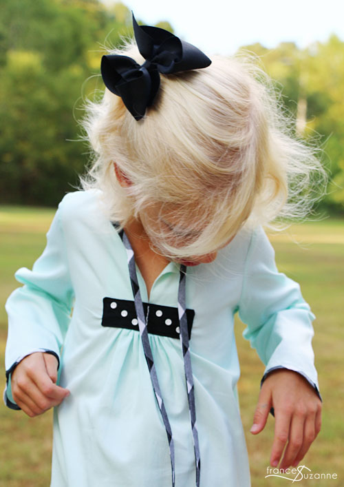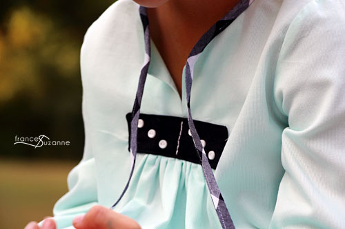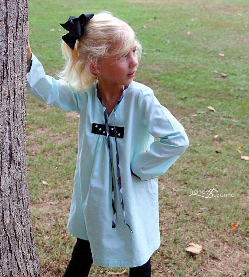 We sewed the Oliver + S, 2+2 blouse . . . but, lengthened and altered it to a tunic / dress with leggings. The leggings were made from the Oliver + S, Playtime Leggings pattern. We sewed both patterns in a size 5. For the tunic, we modified it slightly to include an exposed bias binding along the sleeve.